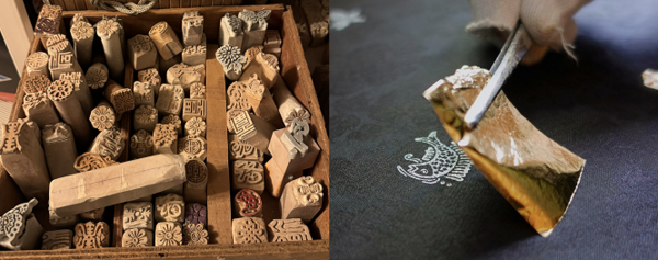 전통 돌금박은 목판을 조각해 만든 도장 위에 민어 부레풀이나 아교 같은 접착제를 바른 후, 접착풀이 완전히 마르기 전에 판을 뒤집어 금박으로 문양을 입히는 우리의 전통 한복에 주로 쓰이던 기술입니다. 이 작업은 몇 일 동안 건조 후 마무리 작업을 거쳐야 완성되며, 주로 과거 고귀한 것들을 제작할 때 사용되었습니다.